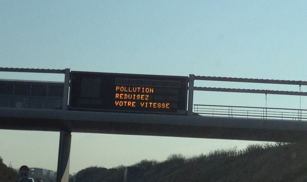 Sicher ist es ein sehr gutes Mittel der Luftverschmutzung entgegenzuwirken, in dem man die zulässige Höchstgeschwindigkeit auf den Autobahnen herabsetzt. Mit Sicherheit habt ihr ausgerechnet, dass eine Verminderung um 20 km/h von 130 auf 110 eine entsprechende Wirkung zeigt. Und bestimmt sind auf euren Autobahnen 90% der Fahrer Franzosen und französisch sprechende Menschen. Aber mal ganz ehrlich: wie sinnvoll ist es auf großen Tafeln zu schreiben