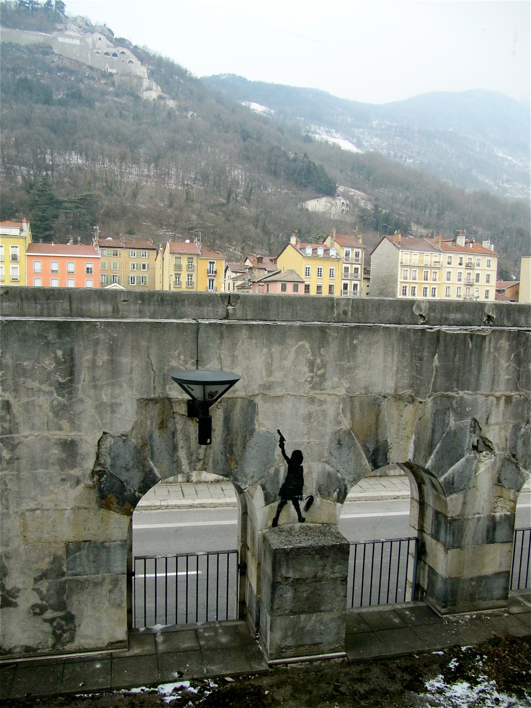 In Grenoble wurde ich mal wieder fündig an einigen Stellen fündig. Für das Kunstwerk, dass ich euch heute zeigen möchte, hat sich der Künstler (oder die Künstlerin) einen ganz besonderen Platz ausgesucht, man erblickt es nämlich, wenn man aus einem der Fenster im Musée de Grenoble blickt. Alleine das finde ich schon großartig.